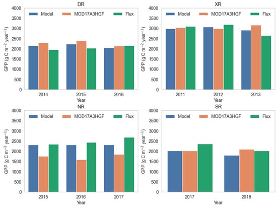 The bar chart in Figure 7 compares the GPP results from prediction models, flux observations, and MOD17A3HGF inversions at four sites: DR, XR, NR, and SR. At the DR site, in 2014, the model-estimated GPP was 2148.65 g C m−2 year−1, very close to the flux observation of 1952.67 g C m−2 year−1, while the MOD17A3HGF value was 2286 g C m−2 year−1. In 2015, the model-estimated GPP was 2231.03 g C m−2 year−1, the flux observation was 2036.39 g C m−2 year−1, and the MOD17A3HGF value was slightly higher at 2382 g C m−2 year−1. In 2016, the model prediction, MOD17A3HGF estimation, and flux observation of GPP were very close, with errors less than 5%. At the XR site, in 2011, the model prediction, MOD17A3HGF estimation, and flux observation of GPP were also very close, with MOD17A3HGF having a smaller error than the model prediction. In 2012 and 2013, the model-estimated GPP was closer to the flux observation results, particularly in 2013, where the model estimation error was only half that of MOD17A3HGF. At the NR site, from 2015 to 2017, the GPP estimates from MOD17A3HGF were significantly lower than both the model predictions and flux observations. At the SR site, in 2017, the model-estimated GPP was consistent with the MOD17A3HGF estimates, about 15% lower than the flux observation. In 2018, the model-estimated GPP was 1801.57 g C m−2 year−1, the flux observation was 2020.32 g C m−2 year−1, and the MOD17A3HGF value was 2096 g C m−2 year−1, closer to the flux observation. However, observing the trend from 2017 to 2018, the flux observed GPP decreased, whereas the MOD17A3HGF estimates increased. The model prediction also showed a decrease, more accurately reflecting the trend. Overall, compared to flux observations, the developed model’s GPP estimates demonstrated high accuracy and consistency across all sites and were more reliable than the MOD17A3HGF estimations.