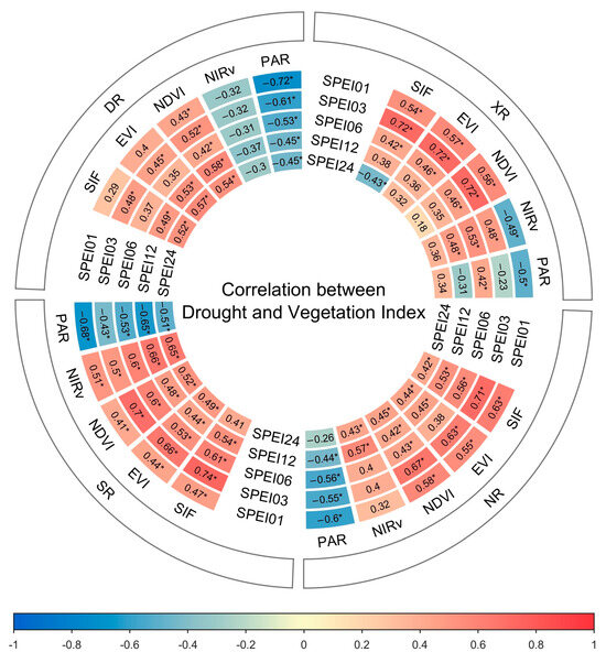 Figure 8 shows the correlation heatmap results between the standardized precipitation evapotranspiration index (SPEI) values at different time scales and vegetation indices (such as SIF, EVI, NDVI, NIRv, and PAR) for four sites (DR, XR, SR, and NR). For the DR site, SPEI12 and SPEI24 show relatively high positive correlations with SIF, EVI, NDVI, and NIRv, with values around 0.5, indicating that prolonged drought significantly impacts vegetation indices. These correlations are statistically significant at the 0.05 level (p < 0.05). For the XR, NR, and SR sites, SPEI03 shows the highest correlations with vegetation indices, with values around 0.7, and these correlations are also statistically significant at the 0.05 level (p < 0.05). At all four sites, PAR is negatively correlated with vegetation indices, with the strongest negative correlation observed with PSEI01. These negative correlations are statistically significant at the 0.05 level (p < 0.05), confirming the reliability of these results. This indicates that the lower the drought index for the month is, the higher the photosynthetically active radiation (PAR) will be.