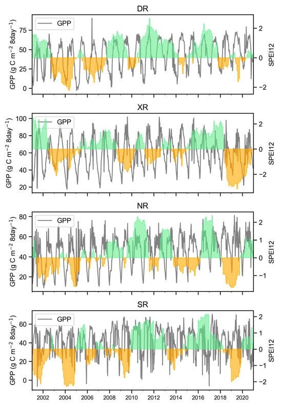 Figure 9 shows the time series of GPP (in gray) and SPEI12 (green representing wet periods, orange representing drought periods). At the DR site, GPP shows an upward trend, with the annual GPP lows increasing over time. Several significant drought periods are highlighted in orange at this site, particularly the prolonged droughts of 2003–2005 and 2007–2009, along with a few shorter drought periods. During the 2003–2005 drought, the eight-day GPP minimum was the lowest from 2001 to 2020, indicating a negative impact of drought on primary productivity. At the XR site, the eight-day GPP minimum values were generally higher than those at DR, with five significant drought events, the most severe occurring around 2019–2020. During this period, the GPP lows were also the lowest in recent years, reflecting the negative impact of drought events on GPP. At the NR site, several major drought periods occurred, mainly around 2004, 2007, and 2015.