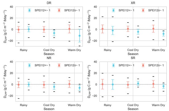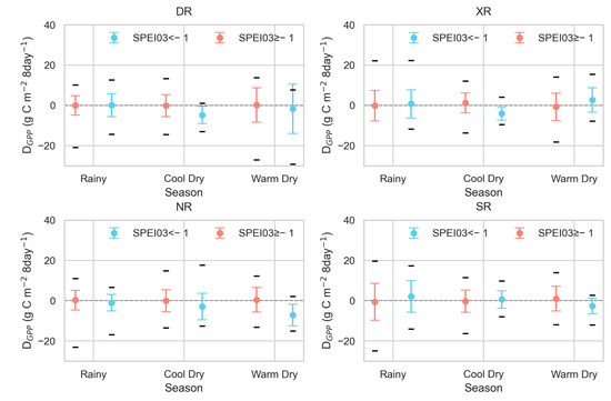 Deviations of GPP under long-term drought conditions during different seasons. Error bars represent 95% confidence intervals, and black lines indicate minimum and maximum values.