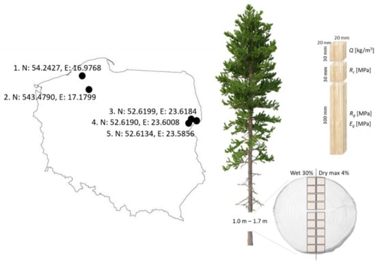 Wood is a chemically complex material. It denotes the characteristic anatomical construction of a particular tree species, which affects its mechanical and physical properties. Differences in the structure and properties of wood can even occur within a single species, e.g., depending on the geographical location [,]. Moreover, the features and properties of wood tissue can differ in a single tree depending on its age, the ratio of young wood to old wood, the ratio of early wood to late wood in the annual rings, the ratio of hardwood to sapwood, and individual wood defects []. Hence, it is particularly significant to obtain raw material at the optimal cutting age for a given species.