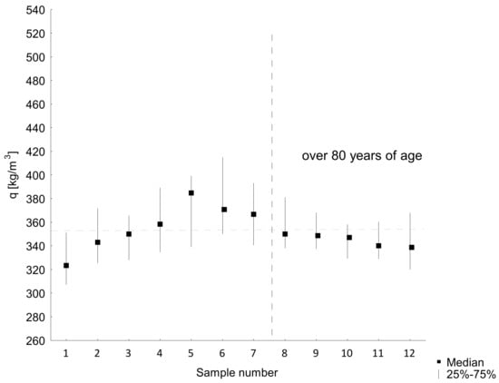 The density medians increased gradually until the age of 60–65, and after which there was a gradual decrease in the median; at approximately 80 years, there was a drop in wood density below the median for the entire population of the studied samples (Figure 2).