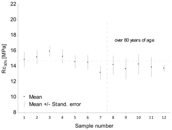 Figure 3 and Figure 4 depict the radial variability of the compressive strength of wet wood (maximal moisture content, Rc30%) and dry wood (Rc0%). In the case of wet wood, there is an increase in the resilience to compressive strength until the age of 30; after turning 60, the resilience to compressive strength drops below the mean (Figure 3). A slightly different trend was observed for the dry wood (Figure 4). It reached the maximum resilience at the age of 60, after which there was a sudden drop in resilience, and it increased again at the age of 90–100, which maintained the mean values.