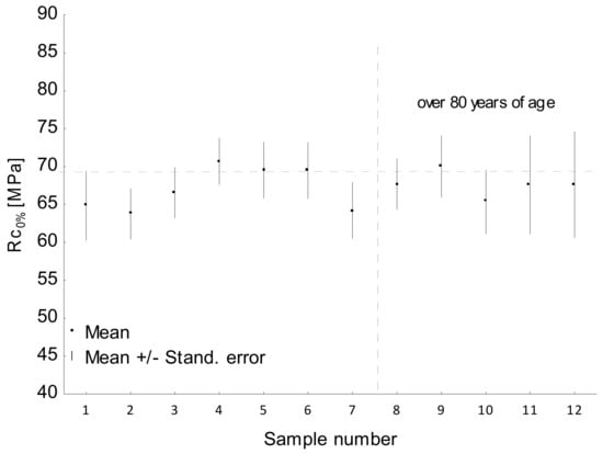 However, the resilience to compressive strength along the grain of dry wood (Rc0%) for spruce wood was much higher than that of wood with maximal saturation (Rc30%), which is a natural occurrence and is related to the submicroscopic structure of wood tissue and its affinity for water. The mean value of resilience to compressive strength of dry wood was 67.34 [MPa]. The indicated confidence interval allows us to conclude with 95% certainty that the mean for that value is within the range of 65.12–69.56 [MPa] (Table 3).