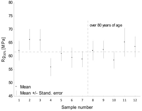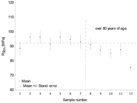 The trend in the variation in the strength of dry wood (Rg0%) was steadier (Figure 6). Until the age of 80 years, the values of Rg0% were above the mean; however, over 80 years, there was a gradual decrease in the value of this wood property. This trend was not characteristic of coniferous species and may be a result of formulating structurally different wood in old trees.
