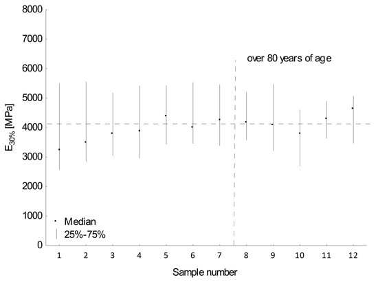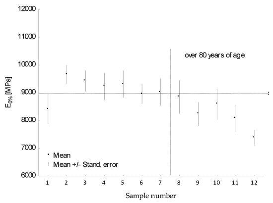 The radial course of the variability in modulus of elasticity of spruce wood is shown in Figure 7 and Figure 8. Generally, modulus of elasticity along the radius for maximally saturated wood was stable and similar to that of the meridian (Figure 7). Lower values for modulus of elasticity occurred in samples 1–4, that is, young wood, and then again in samples 9 and 10 (girth area). The modulus of elasticity was different for dry wood. The horizontal dotted line signifies values below the mean; samples 1 and 8–12 are below this line, which means that above the age of 80, there is a gradual decrease in modulus of elasticity of the dry wood (Figure 8). Similarly, as in the case of resilience to bending strength, this may be evidence of the changes caused by the ageing processes of trees.