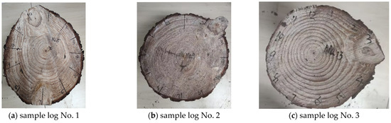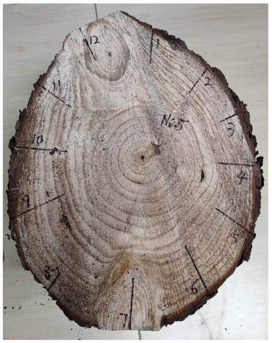 Six logs, comprising four fir logs and two pine logs with natural knots, were sourced from the Xinxin Jinshun wood processing mill in Fujian province for this study. Each log was 200 cm in length, with a diameter at breast height (DBH) of approximately 28 cm. To facilitate the measurements, log samples with prominent and visible natural features were selected. A 60 cm section was cut from each log, and from this section, a log disc with a height of 30 cm was obtained. Each disc was then numbered for identification. The processing steps for the log samples used in this study are illustrated in Figure 1.