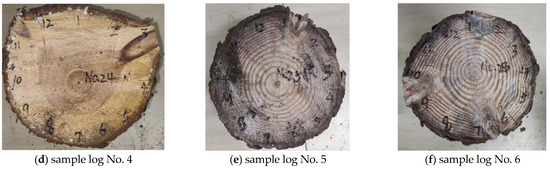 The cross sections of the natural knot side for the six test log samples are shown in Figure 2. Among these, sample logs No. 2, No. 3, and No. 5 have only one knot, sample logs No. 1 and No. 4 have two knots, and only test log No. 6 has three knots. The basic information regarding the tree species and cross-sections of the six sample logs used in this study is summarized in Table 1.