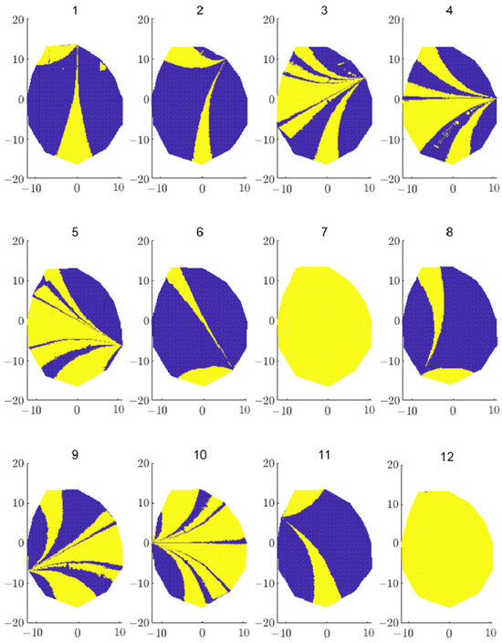 After obtaining the appropriate stress wave velocity curve, the curve for the remaining sections between each measurement point is completed through interpolation. Next, the direction of the knot is determined from each measurement point (as shown in Figure 12). In Figure 12, the yellow part represents the direction of the knot, starting from each point, and the blue part represents the direction from each point, where there is no knot. By superimposing the defect images from all 12 measurement points, a composite defect image is created. Areas with greater overlap in the image indicate a higher likelihood of the presence of a knot.