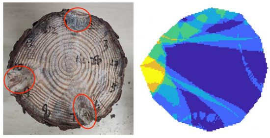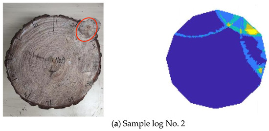 Therefore, for the single-knot sample log, the tomographic imaging algorithm proposed in this paper can roughly predict the location of the knot within the log’s cross-section. However, it cannot accurately predict the shape and size of the knot, and there are noticeable differences compared to the actual knot. Additionally, it should be noted that the imaging algorithm may sometimes predict a single-knot log as having two knots, which requires further analysis and judgment.