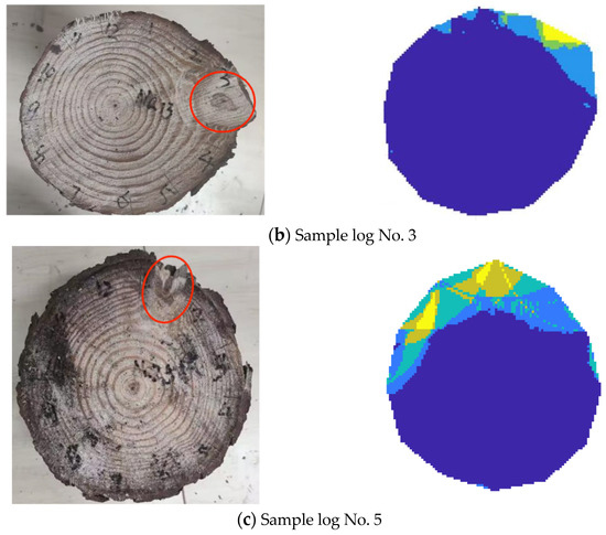 Additionally, when analyzing the cross-sectional appearance of each sample log, sample logs No. 2, No. 3, and No. 5 exhibit a shape close to a perfect circle, with only one knot visible on the cross-section. Among these, the tomography algorithm performed best on sample log No. 2 (see Figure 13a), showing minimal interference in the imaging results. The algorithm effectively identified a small knot in the lower right corner of the cross-section, represented by a minor, distinct yellow area. For sample log No. 3, the knot area predicted by the imaging algorithm is smaller than the actual knot area. This discrepancy arises because the stress wave propagation path for log No. 3 between measurement point 4 bypasses the knot’s location on the cross-section, so the stress wave velocity is unaffected. As a result, the algorithm cannot detect the knot along the path between measurement points 2 and 4, leading to an underestimation of the knot area in the final imaging. Lastly, for sample log No. 5, despite the relative error of the knot area being less than 20%, the imaging results contain interfering color blocks (see Figure 13c). This issue may be attributed to bark detachment at measurement point 3, which likely affected the imaging accuracy.
