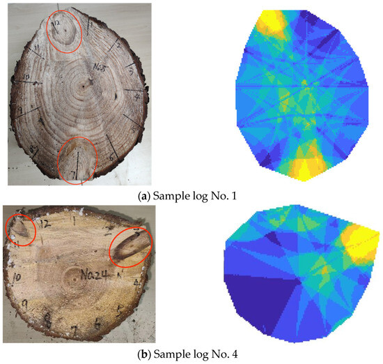 Therefore, while the tomographic imaging algorithm can approximate the locations of some knots in the three-section sample log, it cannot accurately predict the complete position of all the knots in the cross-section. The algorithm’s predictions of knot shapes and sizes are also imprecise, with noticeable differences from the actual knots. For sample logs with three or more knots, it is crucial to scrutinize areas of abnormal wave velocity identified by the imaging algorithm, as these may indicate knot locations, and verify the presence of multiple knots within the log.