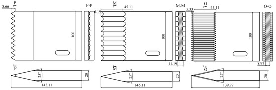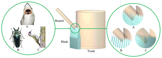 In this study, three bionic blades were designed for the Populus tomentosa pruning robot. Sharks are one of the creatures with the strongest bite, and their teeth are usually sharp and serrated, making them suitable for catching, tearing, and chewing prey. Therefore, scholars often study shark teeth as a prototype for blade bionics [17]. In pruning blade design, a toothed edge angle is used, which aims to increase the local stress and make it easier for the blade to cut into the branch tissues. In this study, shark teeth were used as a prototype when designing a bionic blade, as shown in Figure 1A. It was found through the research that Autocrates aeneus have a special mouthpart structure [18], which is curved on the outside of the upper jaws to ensure that the tooth blades have enough strength when biting and cutting. Therefore, a curved edge angle was designed for the pruning blade to further reduce the cutting resistance, as shown in Figure 1B. Woodpeckers’ beaks have a sharp shape, making them suitable for pecking at trees for food or building nests [19]. Therefore, a pruning blade with a cross-shaped edge angle was designed to further increase the localized stress, as shown in Figure 1C. The technical drawings for the design of the three bionic blades are shown in Figure 2.