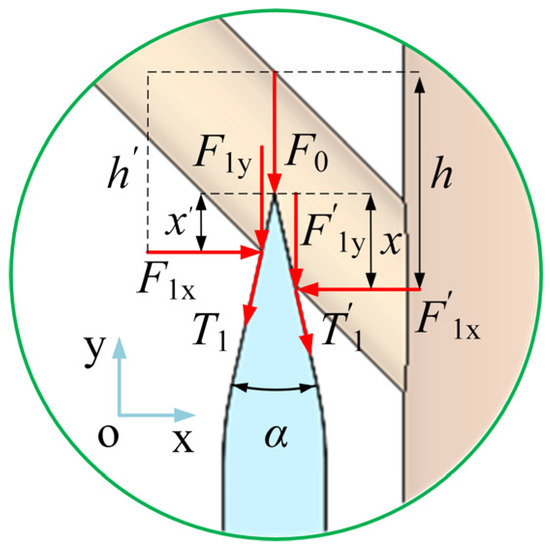 As illustrated in Figure 3, when the blade penetrates the branch, the cutting resistance encountered by the blade primarily consists of several forces, including the reaction force F0 exerted by the branch on the edge as well as the reaction forces F1x, F1y, and friction T1 applied by the branch on the outer edge surface both in the horizontal and vertical directions. Additionally, there are the reaction forces F′1x, F′1y, and friction T′1 exerted by the branch on the inner edge surface, which are also in the horizontal and vertical directions.
