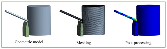 The 3D models of the trunk, branches, and blades were constructed using SolidWorks software (version 2022, SolidWorks Corporation, Waltham, MA, USA) at a scale of 1:1, and the trunk and branches were simplified to cylinders to reduce the computation time, enhance the quality of meshing, and improve the accuracy of the finite element simulation analysis [1]. Then, the constructed 3D model was imported into the LS-DYNA module of ANSYS/Workbench software (version 2022, ANSYS Inc., Canonsburg, PA, USA) to simulate the pruning process.