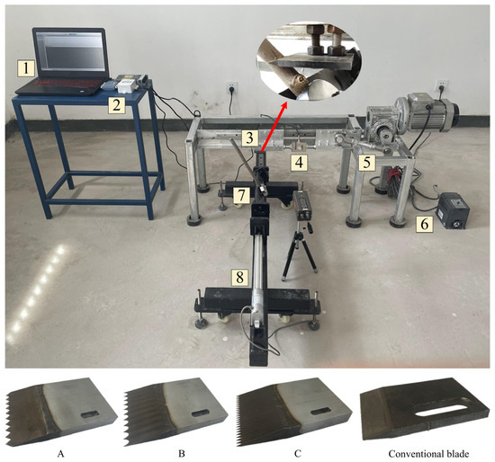 The validation equipment utilizes a self-designed and manufactured impact-cutting branch-cutting test platform, as shown in Figure 5. The cutting test platform primarily consists of four parts: the branch cutting mechanism, branch feeding mechanism, data acquisition system, and parameter adjustment parts. The branch cutting mechanism adopts a crank-slider mechanism to convert the rotary motion of the motor crankshaft into the reciprocating motion of the blade, and the cutting blades are machined from structural steel with a surface roughness of Ra0.8. The branch feeding system consists of a pusher motor that feeds the branches fixed to the branch fixture into the cutting system. The measurement and control system uses an S-type force transducer (JLBS-1, Dysensor Ltd., Bengbu, China, range: ±1000 kg) fixed between the blade and the slider to measure the cutting force, and it utilizes a data acquisition card (MCC-1608G, Chengtec, Shanghai, China, sampling frequency: 250 kS/s) to record the cutting force when cutting the branch.