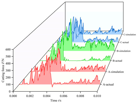 Due to the individual differences in the morphology and mechanical properties of the branches, the cutting force–time curves obtained from the simulation do not exactly match the actual test results, but the curves show the same trend. Some of the results of knife verification when cutting branches with a branch diameter of 14 mm and a branching angle of 45° are shown in Figure 6. The relative errors between the simulated cutting force and the corresponding cutting force of the actual test were obtained from Equation (9), in which δA = 8.24% for the A-type blade, δB = 7.59% for the B-type blade, and δC = 12.73% for the C-type blade, and the relative errors were less than 15%, which indicated that the simulation model could be used for the prediction and analysis of the microscopic process of pruning.