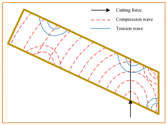 The stress wave propagation law of the pruning process is shown in Figure 7; under the action of cutting load, a compression wave is generated inside the branch. When this compression stress wave reaches the upper surface of the branch, it reflects as a tensile wave. This behavior is analogous to the stress wave propagation mechanism observed under explosive loads. [23,24]. At the same time, due to the upward displacement of the branch cutting point organization, resulting in the formation of tensile waves on the lower side and compression waves on the upper side of the branch near the trunk end, the branch near the trunk end is subjected to the joint action of a variety of stress waves, resulting in large stress. According to the principle of the cantilever beam, the free end of the branch is simultaneously subjected to gravity and cutting force, resulting in a compression wave on the lower side and a tensile wave on the upper side of the free end. Therefore, the free end of the branch will oscillate during the pruning process.