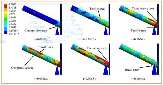 Numerical simulation revealed a consistent pattern, which was exemplified by a branch diameter of 14 mm and branch angle of 65°. Figure 8 illustrates the propagation of the von Mises stress wave. At 0.0008 s, the blade applies a compressive force on the branch tissues, initiating a compression wave. This wave gradually propagates to the upper surface of the branch, where it generates a reflected tensile wave at 0.0016 s. Between approximately 0.0024 and 0.0028 s, as the branch undergoes global deformation, the bending moment at the near-trunk end of the branch increases, leading to the generation of compression and tension waves. Simultaneously, due to the hysteresis of the movement of the free end of the branch, corresponding tensile and compression waves were also generated on the upper and lower surfaces. Before the branch cracked, the stress peaked at about 0.0058 s, resulting from the superposition of multiple waves. After 0.0064 s, the branch broke and the various waves gradually disappeared. Overall, when the stress at the cutting point of the branch or the bonding point with the trunk is greater than the yield limit of the biomass, the branch will crack at the cutting point or the bonding point with the trunk, which is different from the damage mechanism of circular sawing [25]. The stress at the cutting point under cyclic load is significantly greater than that under single load, making it easier to reach the yield limit at the cutting point. Therefore, to ensure effective cutting, it is crucial to investigate biomimetic blade designs aimed at reducing energy consumption during cutting under a single load.