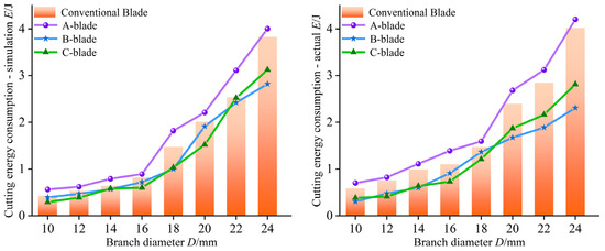 To summarize, the average cutting energy consumption of an A-type blade increases by 14.4%, the average cutting energy consumption of a B-type blade decreases by 18.2%, and the average cutting energy consumption of a C-type blade decreases by 16.3%. The A-type blade has a larger cutting resistance, which is not suitable to be applied in the field of pruning, whereas B-type and C-type blades have a greater advantage in the reduction of resistance and consumption. The experimental results also refine the results of the mechanical analysis of insert drag reduction, where the increase in F0 at the root of the tooth is the main factor leading to an increase in cutting energy consumption for type A inserts, and the increase in T1 and T′1 has a lesser effect on cutting energy consumption for type B and C inserts.