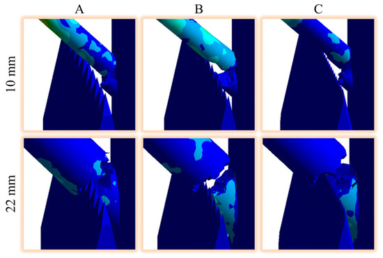 The effect of different branch diameters on the cutting energy consumption of various blade types is shown in Figure 9, and the von Mises stress cloud of the partial cutting effect is shown in Figure 10. Overall, the cutting energy consumption increases with branch diameter, and this increase becomes more pronounced as the diameter grows; this is because the branch yield limit rises exponentially with the increasing diameter. For branches with smaller diameters, the difference in cutting energy consumption between various blade types is minimal. This is because the branch–trunk bond reaches the yield limit of the biomass before the branch itself, resulting in negligible cutting effects from all blade types on the branch. For different branch diameters, the performance of A-type blades in pruning is more moderate compared to conventional blades. However, A-type blades show excellent performance in turning finishing [26] and rock cutting [27] applications, because the metal and rock materials exhibit strong plastic behavior. The lateral forces generated when the blade cuts into metal or rock cause the material to separate, leading to the blade maintaining contact with the material solely at the edge. In the field of pruning, branches as a kind of elastic–plastic material [28]; when the tip of the tooth cuts into the branch, the branch will not break the first time. With the cutting process, the root of the tooth will cause a relatively large cutting resistance, resulting in the overall power consumption of cutting being higher than that of traditional blades. Both B-type and C-type blades can reduce cutting energy consumption with only a small difference in their effectiveness. This suggests that the design of B-type and C-type blades is particularly well suited to the specific requirements of the pruning field.