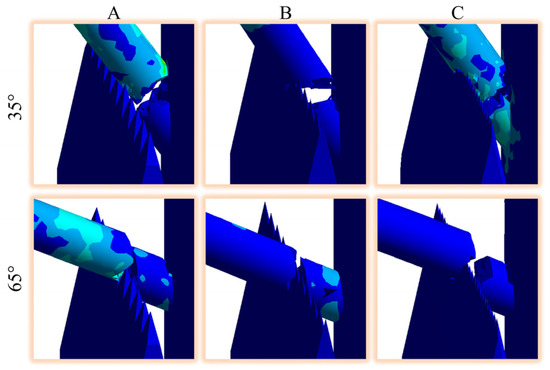 The effects of different branching angles on the cutting energy consumption of various blade types are shown in Figure 11, and the von Mises stress cloud of the partial cutting effect is shown in Figure 12. As the branching angle increases, the cutting energy consumption decreases. Smaller branching angles are more likely to result in breakage at the branch–trunk bonding point, whereas larger branching angles bring branches closer to complete cutting. Type A blades result in higher cutting energy consumption across all branching angles, whereas type B and C blades significantly reduce energy consumption compared to conventional blades. This reduction is attributed to the cutting state of the bionic tooth edge, which enhances the sliding effect. The presence of this sliding effect reduces cutting resistance and improves the overall cutting efficiency.