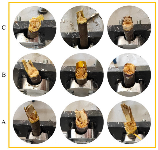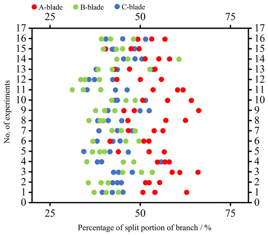To demonstrate the performance of the bionic blades, a cutting test was conducted using the cutting test rig depicted in Figure 5, and some of the results are presented in Figure 13. Criteria for evaluating the effectiveness of fracture were introduced based on previous studies [29]. Under the action of impact cutting force, the branch undergoes cutting behavior first and then splitting behavior. The percentage value of the split portion of the branch is used as an evaluation index. The statistical results of the percentage of splitting of the three bionic blades are shown in Figure 14. From the test results, it can be seen that type A blades are more likely to cause branch splitting, and type B and type C blades cut down branches with less splitting. In practical applications, considering the relatively complex machining process of the curved surface of the B-type blade, the C-type blade is more advantageous in terms of cost-effectiveness. Overall, the bark remains after cutting, and the flatness of the cut section is inferior compared to the shear effect. Therefore, it is necessary to optimize the simulation model to further consider the influence of the wood structure in subsequent studies. Additionally, continued optimization of the bionic blade structure is essential to improve the quality of the cutting section.