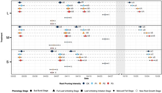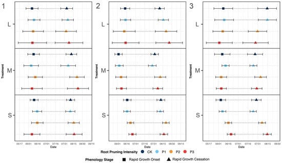 4.1. Effects of Root Pruning Intensity and Seedling Sizes on Key Phenological Traits