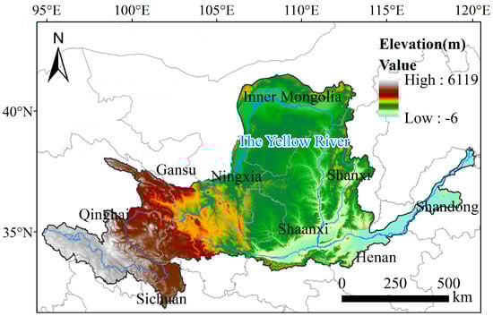The YRB, which begins in the Qinghai–Tibet Plateau, extends across 9 provinces, covering an area of 79.5 × 104 km2 and a length of 5464 km (Figure 1). Known as the “mother river” of China, the YRB plays a pivotal role in the birth of Chinese civilization [30]. Throughout over 3000 years of Chinese history, the YRB served as the nation’s political, economic, and cultural center [31]. It remains a vital region for population activities and economic development and is a key water supply area in China. The YRB exhibits distinct topographic variations, characterized by a three-step distribution from west to east, with high elevations in the west and lower in the east. The upper reaches are dominated by mountains and grass land plateaus, all of which are situated above 3000 m. In the middle reaches, the region is filled with mountains and valleys, featuring rapid water flow and steep slopes.