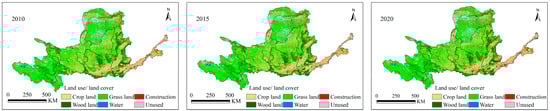 Figure 2 exhibits the changes in land use patterns in the YRB for the years 2010, 2015, and 2020. Grass land constitutes the predominant land use type, followed by crop land and forest land. Between 2010 and 2020, both crop land and unused land areas showed a decreasing trend. Specifically, the crop land area declined from 214,663 km² in 2010 to 205,744 km² in 2020, marking a loss rate of 3.47% (Table 3). Similarly, the area of unused land dropped from 73,531 km² in 2010 to 64,340 km² in 2020, resulting in a loss rate of 10.43%. Conversely, the areas of forest land, grass land, water bodies, and construction land all increased. Notably, the area of construction land saw the highest growth rate at 32.44%, followed by water bodies at 4.89% and grass land at 1.78% (Table 3). This shift in land use patterns can be attributed to China’s implementation of major forestry ecological projects, such as the natural forest protection project and the conversion of crop land to forest and grass land.