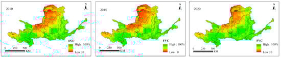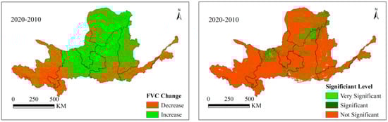 The spatio-temporal distribution of FVC changes in the YRB is illustrated in Figure 3. From 2010 to 2020, the FVC generally exhibited an upward trend, with the average increasing from 60% in 2010 to 65% in 2020 (Figure S1). The lowest FVC was recorded in 2015 (58%), while the highest FVC occurred in 2018 (66%) (Figure S1). Across different years, FVC changes displayed a consistent spatial distribution pattern, increasing from northwest to southeast across the entire basin. Areas with relatively high values were predominantly located in the lower reaches of Shandong and Henan, which are characterized by forest land, crop land, and grass land. Trend analysis indicated a significant FVC increase from 2010 to 2020 in the Inner Mongolia Autonomous Region, Shaanxi Province, Shaanxi Province, Shanxi Province, Ningxia Province, and Gansu Province (Figure 4). Specifically, notable vegetation changes were observed in Baiyin District, Jingtai County, Jingyuan County, and Yongdeng County of Gansu Province, as well as Shenmu city and Yuyang District of Shaanxi Province, Yijinhoruo Banner and Wushen Banner of the Inner Mongolia Autonomous Region, and Youyu County of Shanxi Province (p < 0.01).