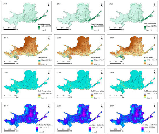 From 2010 to 2020, FP displayed an upward trend, with a growth rate of approximately 24.9%. The average FP in the basin were 55.61 t/km2, 55.55 t/km2, and 69.46 t/km2 in 2010, 2015, and 2020, respectively (Figure S3). The average WY in the basin increased from 138.94 mm in 2010 to 170.03 mm in 2020, reflecting a growth rate of 22.4%. The average SC in 2010 was 80,000 t/hm2, 79,274 t/hm2 in 2015, and 89,600 t/hm2 in 2020. SC showed an improvement trend from 2010 to 2020, with an overall increase of 11.2%. Additionally, LA increased by 1.1% over the same period, with LA values of 28.145, 28.432 and 28.443 in 2010, 2015, and 2020, respectively.