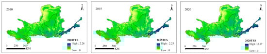 TES comprehensively reflects an ecosystem’s capacity to provide services and is a priority indicator for government and management decision-making. After calculating all standardized ESs, the distribution pattern of TES is depicted in Figure 6. Across three different time scales, TES exhibits a similar spatial distribution, with values increasing from the northwest regions (Gansu and Ningxia) to the southeast regions (Shandong, Henan, and Shanxi). High-value areas are predominantly found in downstream regions such as Henan and Shandong, while low-value areas are concentrated in Ordos and its surrounding counties in the Inner Mongolia Autonomous Region. From 2010 to 2020, TES demonstrated an upward trend, rising from 0.59 to 0.61.