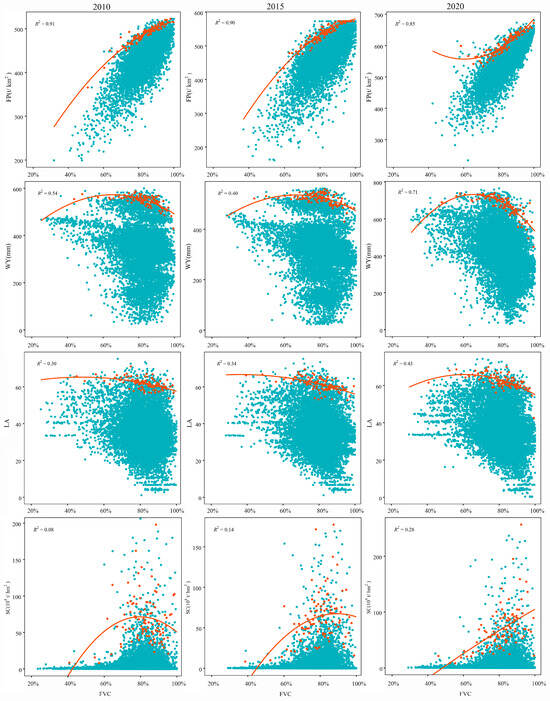 A constraint line analysis was performed to examine the relationship between FVC and various ESs, with specific results illustrated in Figure 7. The constraint line between FP and FVC forms a positive convex curve, with the R2 of the fitting curve exceeding 80% in all three years, indicating a strong fit. This positive convex curve, lacking a maximum value, suggests that FP increases as FVC increases. From 2010 to 2020, both FVC and FP exhibited an upward trend. The constraint line between FVC and WY is represented by a hump-shaped curve. When FVC is around 80% in all three years, WY reaches its maximum value, indicating that WY increases with FVC up to 80% and decreases beyond that point. The maximum value of the WY and FVC constraint lines in 2020 was approximately 750 mm. The constraint line between FVC and LA is also a hump-shaped curve, with the R2 value ranging from 0.3 to 0.4 across the three years. LA reaches its peak when FVC is around 60%, increasing with FVC up to this point and decreasing thereafter. The peak values of the FVC and LA fitting curves showed minimal changes over the three years. The fitting curve for SC and FVC is another hump-shaped curve. with SC peaking when FVC is around 80%; beyond this value, SC decreases as FVC increases.