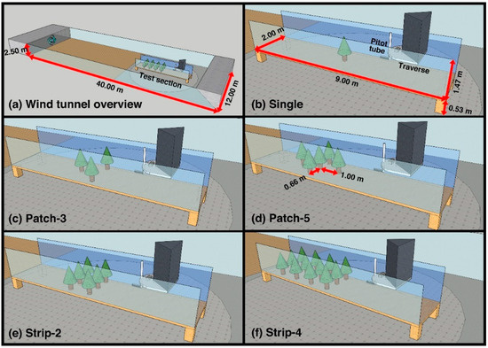 Wind monitoring of forests is conducted using automatic weather stations, flux towers, or unmanned aerial vehicles, but it is challenging to observe the spatiotemporal pattern of the wind environment of forests via these methods due to the complex interactions within forest environments. Computational simulation approaches, such as large-eddy simulations, can represent the spatiotemporal complexity of forest wind environments [22,23]; however, they require huge computational resources, restricting their applicability. Wind tunnel experiments that imitate forest environments using a scaled-down model are an affordable approach for predicting the forest wind environment within the desired controlled experimental conditions.