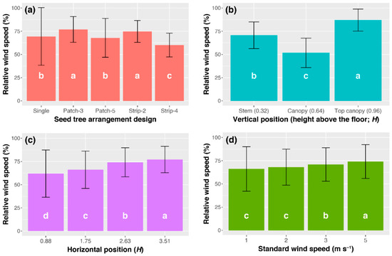 Comparison of the changes in the relative wind speed by (a) seed tree arrangement, (b) vertical position, (c) horizontal position, and (d) free-stream wind speed. The relative wind speed is defined as the ratio of the measured wind speed (U) to the free-stream wind speed (Uf) set in the wind tunnel controller. Different letters indicate significant differences among the bars tested by a four-way analysis of variance with Tukey’s HSD test (p < 0.05). Error bars indicate one standard deviation. Patch-3 and -5 defined the patches of 3 and 5 seed trees. Strip-2 and -4 define the 2- and 4-strip seed trees. The vertical and horizontal positions are expressed in terms of the canopy height (H), which is equivalent to the average height of the experimental saplings (1.14 m).