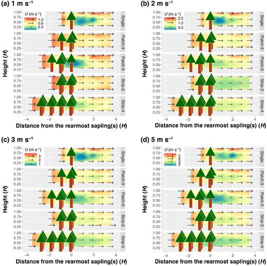 Changes in the wind speed by seed tree arrangement after passing through the sapling(s) at a series of free-stream wind speeds ((a): 1 m s−1, (b): 2 m s−1, (c): 3 m s−1, (d): 5 m s−1). A grid map with the spectral color indicates the wind speed, which is interpolated using the wind speed at each measurement point. The vertical and horizontal positions are expressed in terms of canopy height (H).