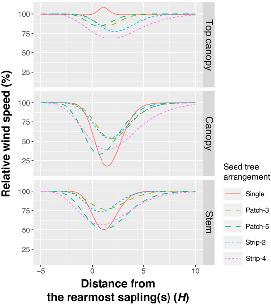 In contrast, in the canopy and stem layers, there was no clear pattern of change in the relative wind speed along the leaf area; rather, a complex interaction between the seed tree arrangement and the vertical position was observed (Figure 6b,c). For example, in the canopy layer, the single tree with the smallest leaf area was expected to achieve the highest relative wind speed; however, the relative wind speed in the Single arrangement was lower than that in the other seed tree arrangements, except Strip-4.
