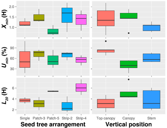 Figure 4 illustrates the simplified patterns of wind speed changes by passing the sapling(s) using the empirical model developed for windbreak effects, and Figure 5 shows the distribution of the parameters for wind speed reduction and recovery curves by seed tree arrangement and vertical position. All the curves were statistically significant (p < 0.05), suggesting several patterns. First, the distance from the rearmost sapling(s) that reached the bottom peak (Xmin) ranged from 0.63 to 2.19 H, depending on the seed tree arrangement and the vertical distance. It was closest to the stem layer (1.02 H), followed by the top canopy (1.41 H) and canopy layer (1.44 H) (Figure 5). Second, wind speed reduction, indicated by the bottom peak, was greatest in the canopy layer, followed by the stem and top canopy layers. This is confirmed by the mean Umin of each vertical position: 85.0% for the upper canopy, 39.7% for the canopy, and 61.6% for the stem layer (Figure 5). Third, the shelter distance (L20) ranged from 1.57 to 7.60 H, being the longest at Strip-4 (6.12 H), followed by Patch-5 (5.42 H), the Single (3.73 H), Patch-3 (3.13 H), and Strip-2 (2.76 H).