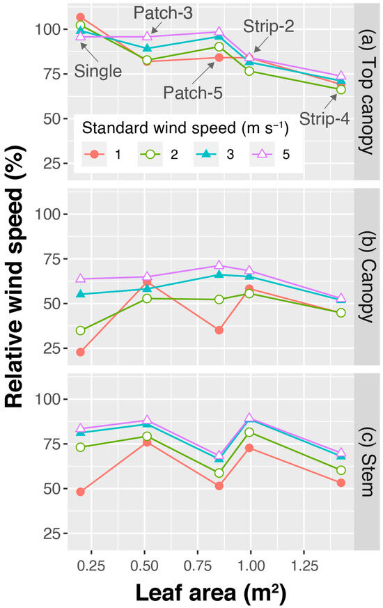 A greater reduction in wind speed was observed in larger leaf areas in the top canopy layer (Figure 6a). Overall, a negative relationship between the leaf area and relative wind speed was observed from Single to Strip-4. However, the relative wind speed did not decrease from Patch-3 to Patch-5, but rather slightly increased, even though the leaf area of Patch-5 was approximately 1.7 times greater than that of Patch-3.