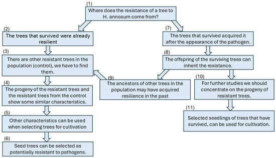 It should be noted that the ecological consequences of promoting disease-resistant trees in monocultures need to be discussed. A healthy forest is a forest in which there are also diseased and dying trees that, decomposed by fungi, release nutrients into the soil that enter the carbon or nitrogen cycle. Compromises must therefore be made with regard to forest biodiversity and ecosystem services. One of these compromises is to leave a few percent of the trees (4%–7%) in the stands to decompose naturally. Selection for resistant genotypes can also undoubtedly have a negative impact on biodiversity. H. annosum has been found to produce substances that we can use to treat colon cancer. Therefore, its complete removal from the forest environment would be unfavourable for us from this point of view. From the point of view of the forest ecosystem, the situation is similar: the gaps in the monocultures created by the activity of the root pathogens are filled by other tree species (birch, maple, or oak), which has a positive effect on the genetic diversity (pool) at the organism level and thus on the resilience of the pine population.