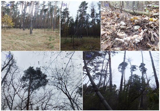 1]. From year to year, the trees around the gap gradually die, and the gap widens. Along the gap, the active edge of the disease centre, there is a constant differentiation of trees according to their condition—from healthy trees with external signs to diseased dying and dead wood. Ukraine’s forests are made up of more than 30 species of trees, with pine (