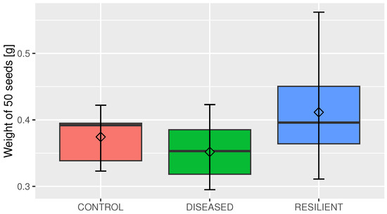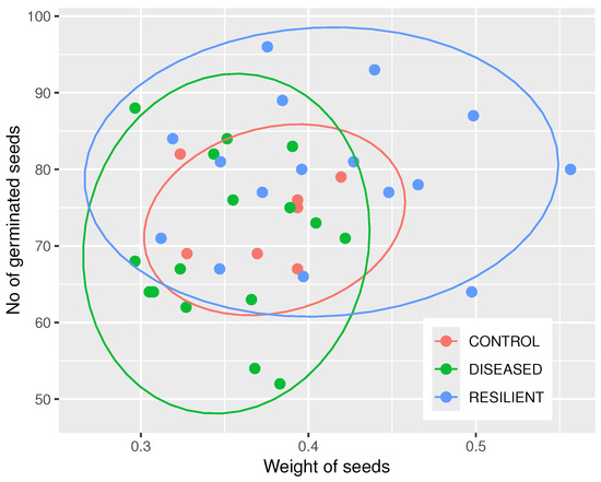 In the case of correlation analysis (e.g., seed weight and germination), the lack of correlation is interesting, but it is difficult for us to speculate on the possible causes of this phenomenon. However, there was a statistically significant difference in seed weight between the groups. We hypothesise that other factors (e.g., seed quality, environmental conditions) might be more decisive. This situation requires new hypotheses and further research. Perhaps seed weight does not matter in the first stages of germination until nutrients are depleted before the seedling is well rooted in the soil and takes over the physiological functions of absorbing water and mineral salts from the soil required for adequate photosynthetic efficiency.