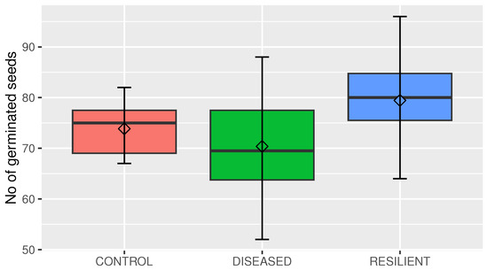 The analysis of the results of this study showed that trees classified as resistant are characterised by a slightly higher average number of cotyledons in the progeny and longer roots, produce heavier seeds, and germinate in greater numbers (better seed quality class), especially compared to seedlings from diseased trees. This is probably due to the fact that infected trees expend a lot of energy defending themselves against pathogens. Plants and pathogens have developed a dynamic interaction. While the plants try to survive after the attack of the pathogens with different mechanisms, the latter try to maximise food consumption to ensure their reproduction and dispersal [