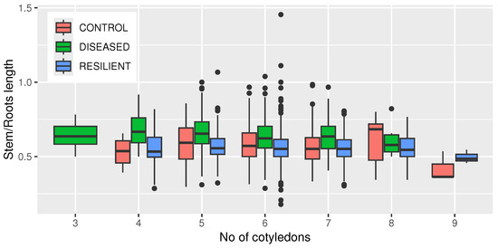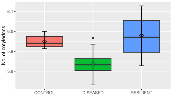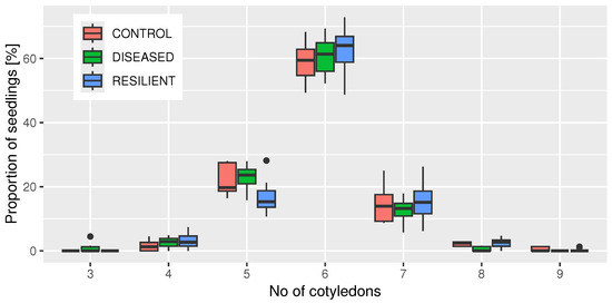 An important finding about cotyledons is their role in seedling vigour and resistance to root diseases. Unfortunately, the exact mechanism for the correlation between the number of cotyledons and immunity is not yet fully understood. However, it cannot be overemphasised how cotyledons help to secure seedling energy reserves or immune response pathways. As previously written, the largest proportion of seedlings came from resistant trees with six cotyledons. This can be selected as a quantitative trait in breeding programmes, especially as it is probably heritable, but this needs to be confirmed in further studies. Although the significant differences in the number of cotyledons between the healthy groups are convincing, we decided to describe the biological implications of these results in more detail. It is likely that the diseased group with fewer cotyledons has a less efficient photosystem II, which affects the general condition and even the survival of the seedlings. This is due to the insufficient production of assimilates, which are necessary for all physiological processes of plants, especially for the response to stress or other factors affecting plant development (e.g., root nutrition). Kitajima [