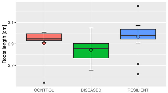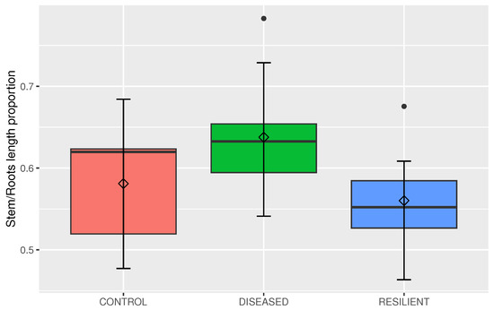 65], it was found that biometric parameters of the reproductive organs of pines with different degrees of resistance to root rot were resistant trees that had a higher average cone weight than infected and control trees in a healthy closed forest stand. In addition, the mass of their 1000 seeds in the intercellular space was close to the mass of the healthy trees. These values were lowest in diseased trees. The biometric characteristics of one-year-old pine seedlings grown in a nursery from seeds of ‘diseased’ trees located mainly at the edge of the gap, ‘healthy’ trees located in the intercellular space outside the disease centre, and ‘conditionally resistant’ trees located in the gaps of the gaps showed that a characteristic feature of the one-year-old progeny of ‘conditionally resistant’ trees grown within the disease centre of the root rot is a much longer seedling root system, which may allow it to survive under conditions of high disease infestation [