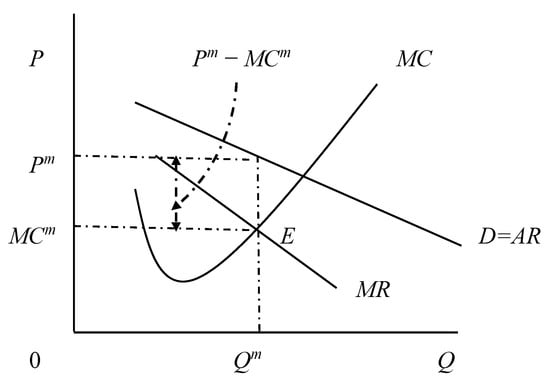 Early research often conflated market power with monopoly power, although the two concepts are fundamentally different. Both relate to a firm’s ability to price above marginal cost, but they diverge significantly in nature. Unlike monopoly power, market power typically does not lead to profits that exceed the average competitive level, and it is generally short-lived, unable to be sustained in the long term. Consequently, firms with market power should not be the primary targets of antitrust enforcement. Moreover, subsequent studies have shown that a firm possessing monopoly power does not necessarily have market power, and conversely, a firm with market power does not always hold monopoly power. This further underscores that market power is not equivalent to monopoly power (Bannock, 2005) [39]. From a microeconomic perspective, the mechanism by which international market power operates is illustrated in Figure 1. In this diagram, D, MC, MR, and AR represent the demand curve (downward-sloping), marginal cost curve, marginal revenue curve, and average revenue curve (which coincides with the demand curve), respectively. According to the profit-maximization condition in an imperfectly competitive market (MR = MC), the firm’s equilibrium output and price should occur at point E, where MR intersects MC, corresponding to Qm and MCm. However, since the D curve lies above the MR curve, the firm can set its transaction price based on the demand curve at Pm. When Pm − MCm > 0, the firm has pricing power, indicating the presence of market power. The greater the value of Pm − MCm, the stronger the firm’s market power, which is visually depicted by the vertical distance between Pm and MCm in the figure (Young, 2000) [40]. This relationship is intricately linked to the price elasticity of demand (ε), with the price-cost markup expressed as (Pm − MCm)/Pm = −1/ε. The left-hand side of the equation represents the price-cost markup.