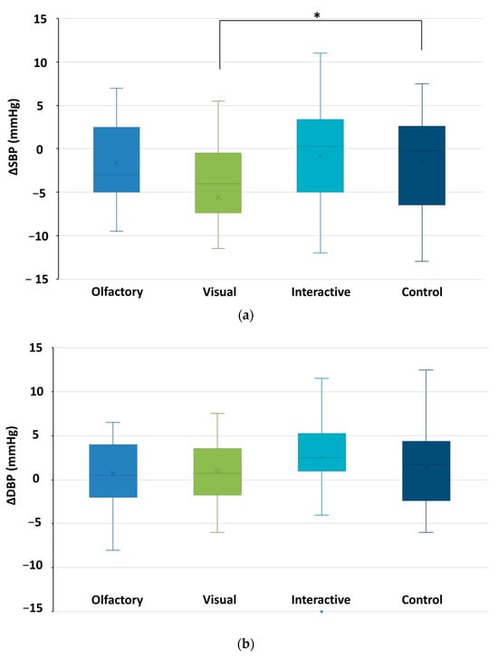 An ANOVA analysis was performed to investigate potential variations in physiological metrics across different groups, subsequently facilitated by a post hoc LSD test for detailed comparisons. In all three stimulation scenarios, no notable deviations were observed in blood pressure, pulse pressure variation, or pulse readings compared with the baseline measurements, except for systolic pressure in response to visual stimulation (ΔSBP: control, M = −1.60, SD = 2.05; olfactory, M = −1.68, SD = 0.23, p > 0.05; visual, M = −5.58, SD = 1.83, p < 0.05; olfactory–visual, M = −0.90, SD = 2.00, p > 0.05, Figure 4a; ΔDBP: control, M = 1.46, SD = 2.08; olfactory, M = 0.72, SD = 0.16; visual, M = 1.07, SD = 0.31; olfactory–visual, M = 2.50, SD = 0.98, p > 0.05, Figure 4b; ΔPP: control, M = −3.06, SD = 1.69; olfactory, M = −2.39, SD = 0.52; visual, M = −4.62, SD = 3.60 m; olfactory–visual, M = −3.40, SD = 3.00, p > 0.05, Figure 4c; ΔP: control, M = 0.02, SD = 2.61; olfactory, M = 1.85, SD = 1.70; visual, M = 0.97, SD = 0.05; olfactory–visual, M = −0.23, SD = 1.29, p > 0.05, Figure 5). The mean scores of each participant’s SC values relative to the baseline during the experimental period were computed, and the corresponding averages are depicted in Figure 6. Significant distinctions were observed in the olfactory–visual interactive stimulation group compared with the control (ΔSC: control, M = −0.47, SD = 0.01; olfactory, M = −0.23, SD = 0.12, p > 0.05; visual, M = −0.23, SD = 0.17, p > 0.05; olfactory–visual, M = −0.06, SD = 0.15, p < 0.01). The olfactory and visual stimuli groups did not exhibit a notable distinction from the control group.