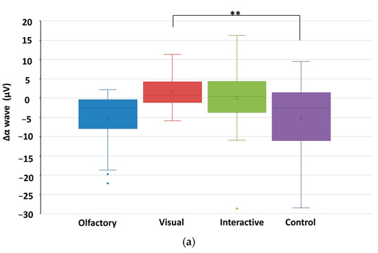 The graphical representation in Figure 7 illustrates the mean values of alpha and beta waves in relation to the established baseline across the four experimental stimuli. Notably, a discernible deviation was observed exclusively under the visual stimulation condition when compared with the control scenario (Δα waves: control, M = −5.18, SD = 6.64; visual, M = 2.17, SD = 1.00, p < 0.01, Figure 7a; Δβ waves: control, M = −3.26, SD = 3.5; visual, M = 1.82, SD = 0.18, p < 0.01, Figure 7b).