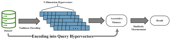 In a comprehensive evaluation of modern computing technologies, HDC demonstrates significant potential and application prospects through its rapid learning processes, low latency, high efficiency, robustness closely aligned with neuroscientific principles, compact model sizes, and reduced sample requirements. Figure 3 shows the basic block diagram of HDC. First, each real-valued feature in the dataset is encoded into a hyperdimensional vector of dimension N (usually N is thousands or tens of thousands) using a nonlinear coding method and then stored in the associative memory (AM) as a category hypervector after a series of operations (such as addition, multiplication, bundling, etc.). The hypervectors participating in the test form a query hypervector in the same encoding method, and then a series of similarity comparisons are performed in AM, and the result is output based on the difference in similarity. Below, we will introduce some basic theories of HDC, including its unique high-dimensional characteristics, calculation methods, some important indicators, etc.